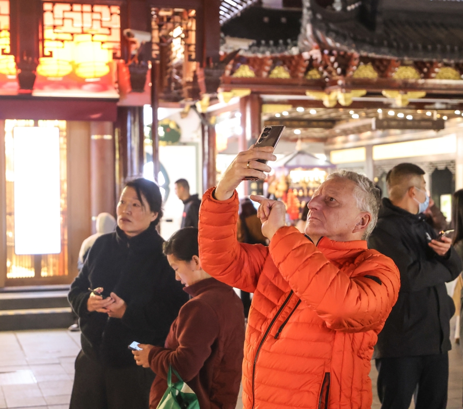 华灯初上,芬兰游客罗拉举着手机不停拍摄,包括完整的3分钟“冬之境”视频,“太美了,仿佛灯光精灵在屋檐上跳舞,我要传到社交网站上,给朋友们看看。”